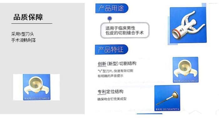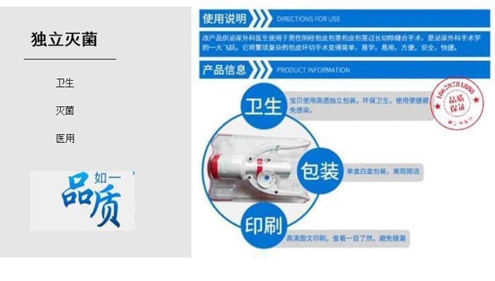该产品供泌尿外科医生使用于男性阴经包皮包茎包皮包茎过长切除缝合手术,是泌尿外科手术学的一大飞跃。它将繁琐复杂的包皮环切手术变得简单,医学,医用,方便,安全,便捷。