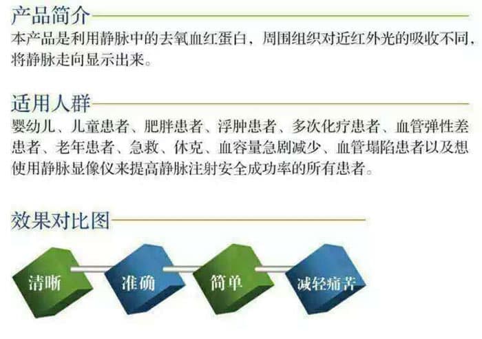本产品是利用静脉中的去氧血红蛋白,周围组织对近红外光的吸收不同,将静脉走向显示出来。